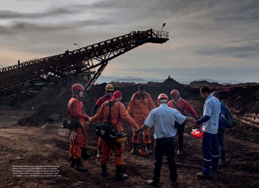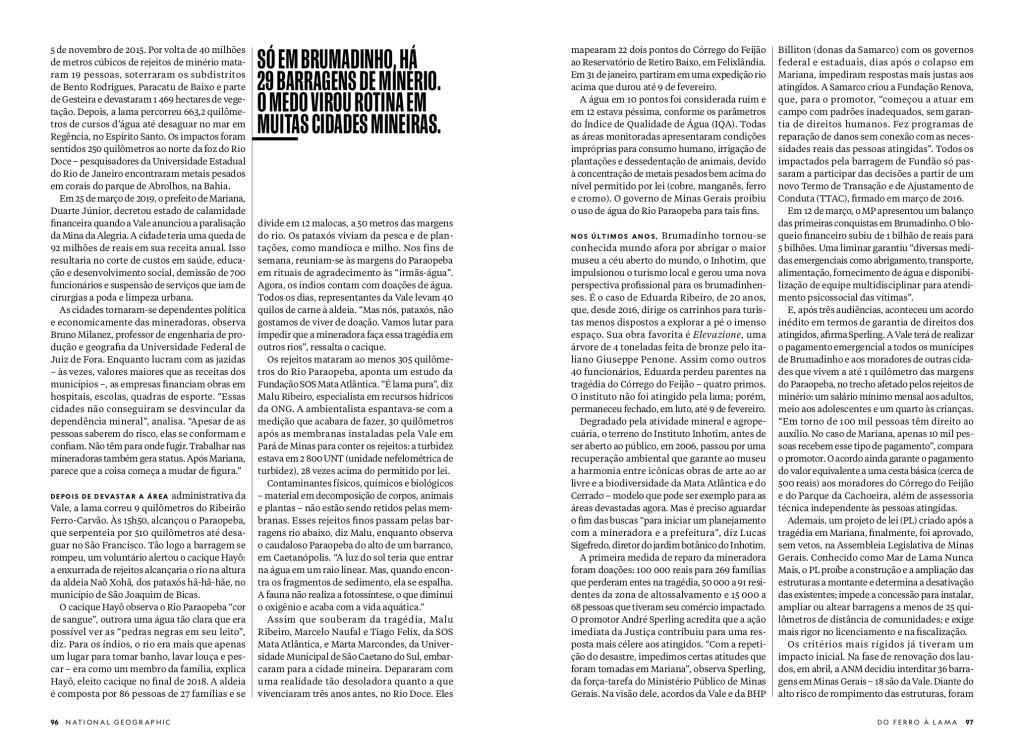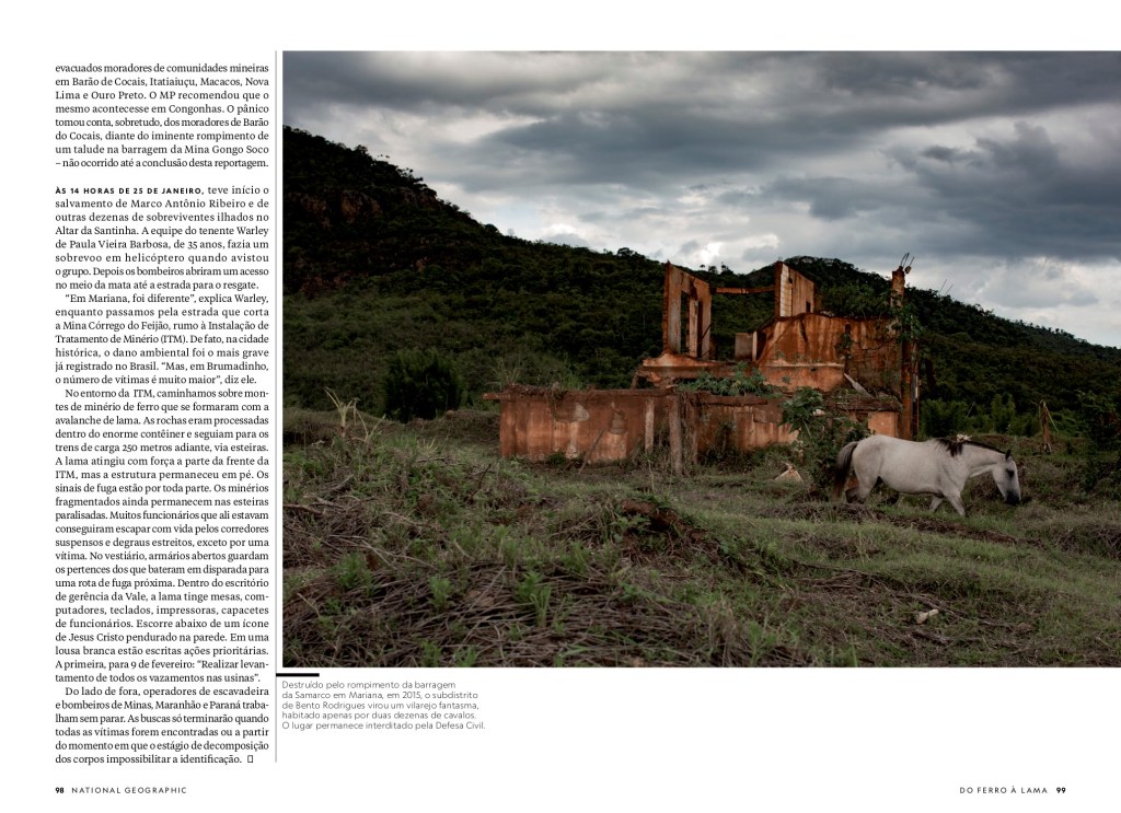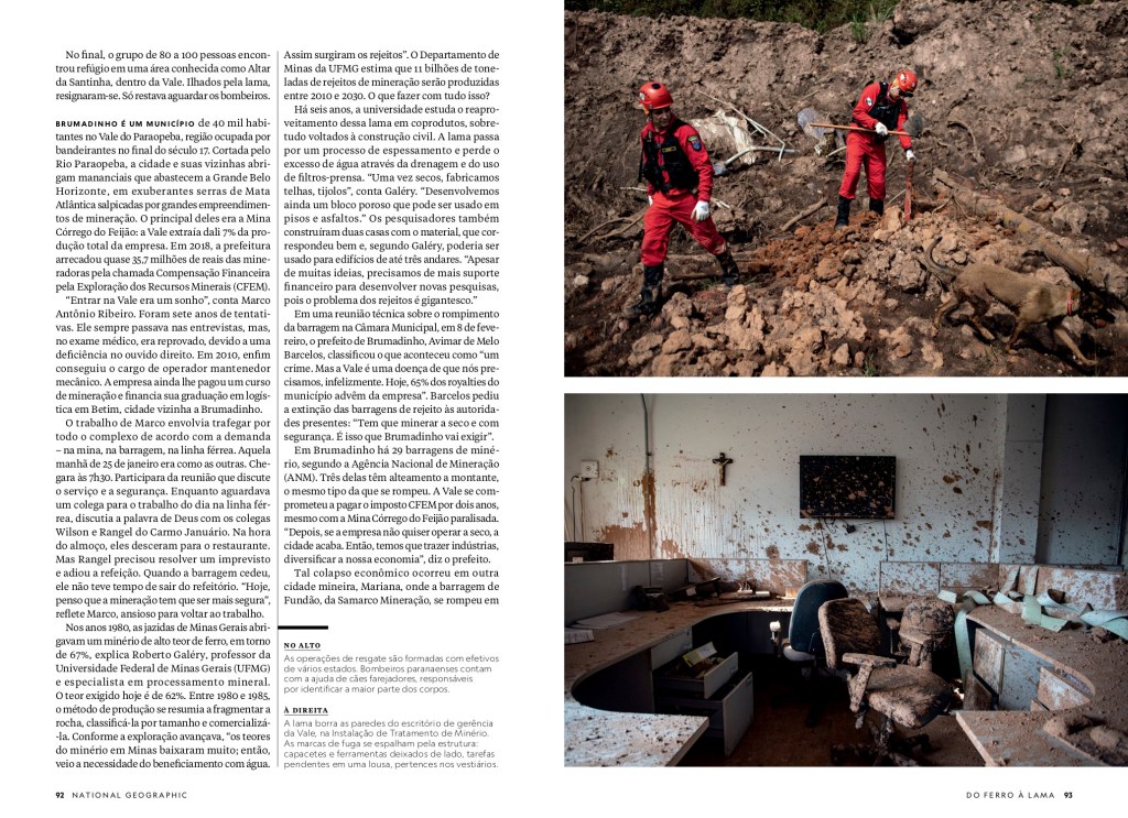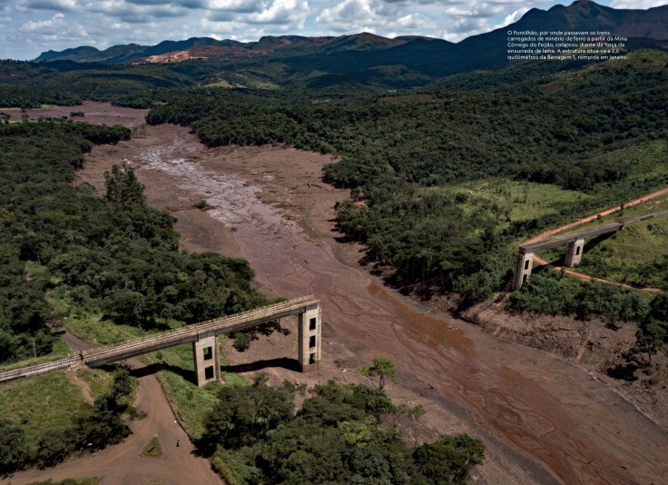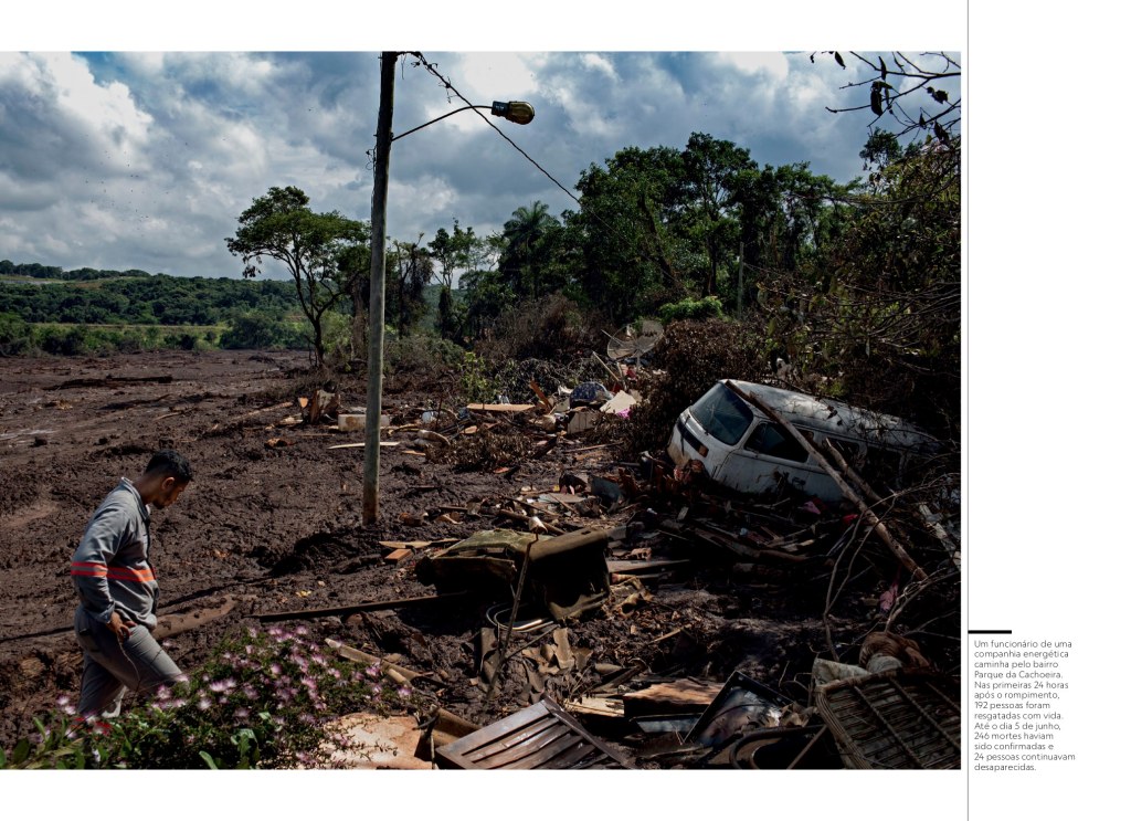 Tal colapso econômico ocorreu em outra cidade mineira, Mariana, onde a barragem de Fundão, da Samarco Mineração, se rompeu em 5 de novembro de 2015. Por volta de 40 milhões de metros cúbicos de rejeitos de minério mataram 19 pessoas, soterraram os subdistritos de Bento Rodrigues, Paracatu de Baixo e parte de Gesteira e devastaram 1 469 hectares de vegetação. Depois, a lama percorreu 663,2 quilômetros de cursos d’água até desaguar no mar em Regência, no Espírito Santo. Os impactos foram sentidos 250 quilômetros ao norte da foz do Rio Doce – pesquisadores da Universidade Estadual do Rio de Janeiro encontraram metais pesados em corais do parque de Abrolhos, na Bahia.