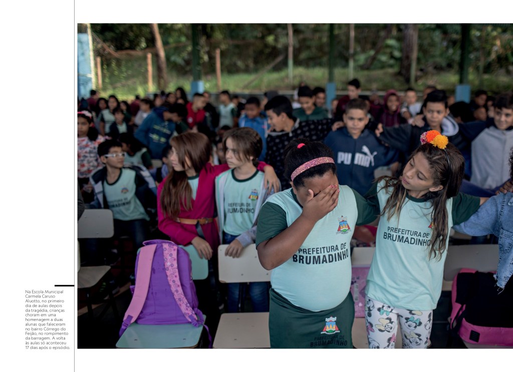 No entorno da ITM, caminhamos sobre montes de minério de ferro que se formaram com a avalanche de lama. As rochas eram processadas dentro do enorme contêiner e seguiam para os trens de carga 250 metros adiante, via esteiras. A lama atingiu com força a parte da frente da ITM, mas a estrutura permaneceu em pé. Os sinais de fuga estão por toda parte. Os minérios fragmentados ainda permanecem nas esteiras paralisadas. Muitos funcionários que ali estavam conseguiram escapar com vida pelos corredores suspensos e degraus estreitos, exceto por uma vítima. No vestiário, armários abertos guardam os pertences dos que bateram em disparada para uma rota de fuga próxima. Dentro do escritório de gerência da Vale, a lama tinge mesas, computadores, teclados, impressoras, capacetes de funcionários. Escorre abaixo de um ícone de Jesus Cristo pendurado na parede. Em uma lousa branca estão escritas ações prioritárias. A primeira, para 9 de fevereiro: “Realizar levantamento de todos os vazamentos nas usinas”.