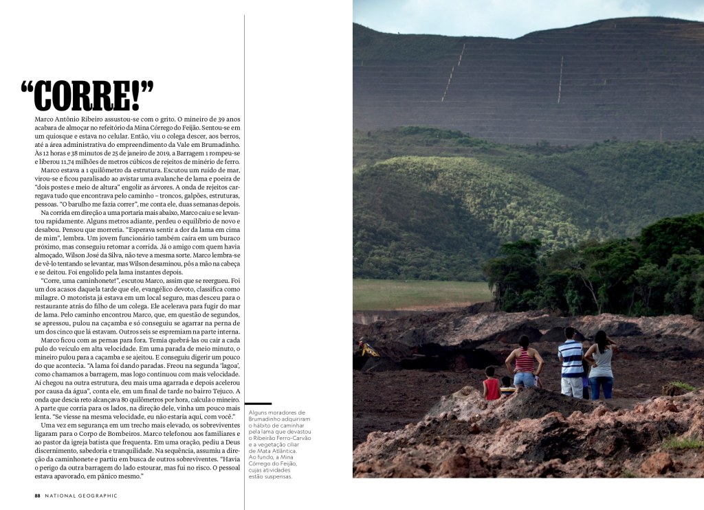 Marco estava a 1 quilômetro da estrutura. Escutou um ruído de mar, virou-se e ficou paralisado ao avistar uma avalanche de lama e poeira de “dois postes e meio de altura” engolir as árvores. A onda de rejeitos carregava tudo que encontrava pelo caminho – troncos, galpões, estruturas, pessoas. “O barulho me fazia correr”, me conta ele, duas semanas depois.