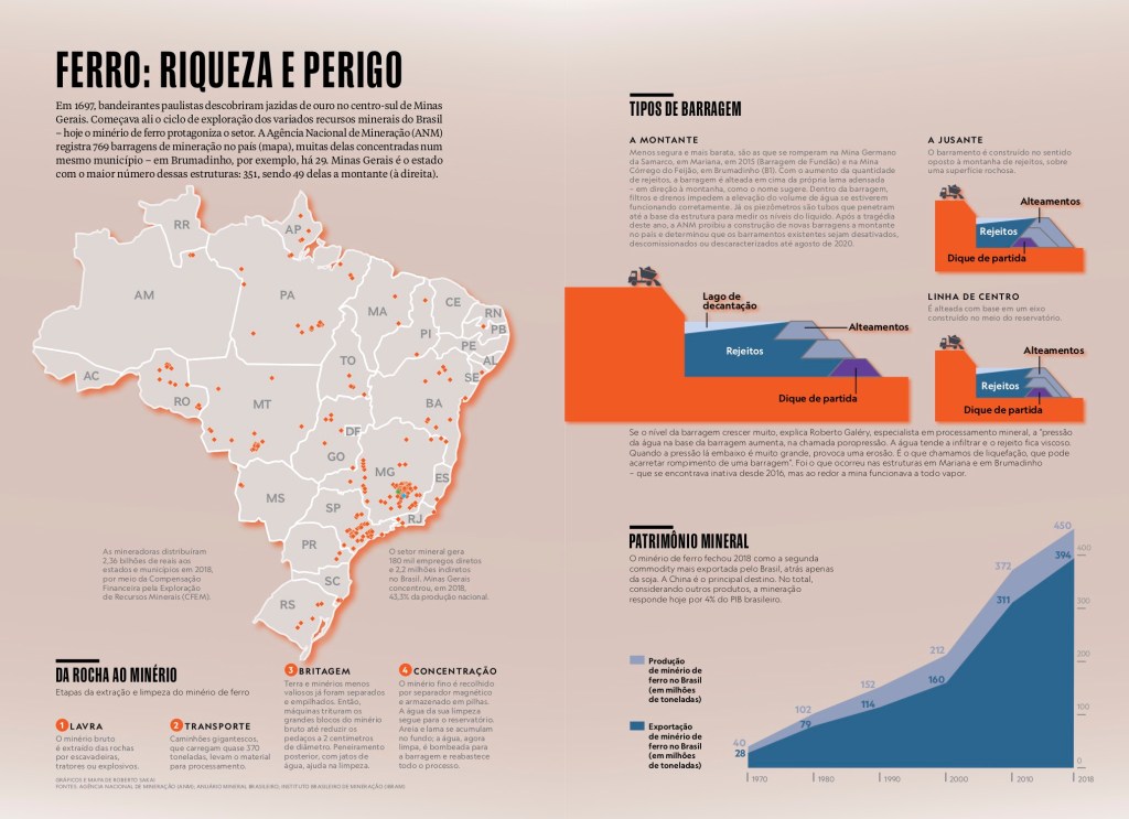 O rompimento da barragem de Brumadinho resultou em 270 vítimas e poluiu de morte mais de 300 quilômetros do rio Paraopeba. A tragédia suscitou um debate sobre a segurança na histórica atividade mineradora no Brasil.