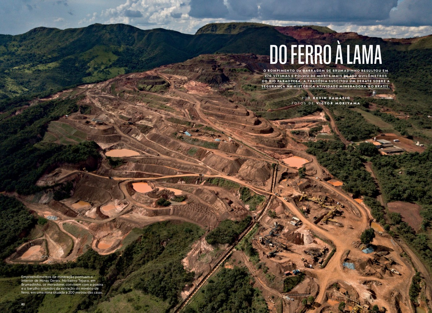BRUMADINHO É UM MUNICÍPIO de 40 mil habitantes no Vale do Paraopeba, região ocupada por bandeirantes no final do século 17. Cortada pelo Rio Paraopeba, a cidade e suas vizinhas abrigam mananciais que abastecem a Grande Belo Horizonte, em exuberantes serras de Mata Atlântica salpicadas por grandes empreendimentos de mineração. O principal deles era a Mina Córrego do Feijão: a Vale extraía dali 7% da pro- dução total da empresa. Em 2018, a prefeitura arrecadou quase 35,7 milhões de reais das mineradoras pela chamada Compensação Financeira pela Exploração dos Recursos Minerais (CFEM).